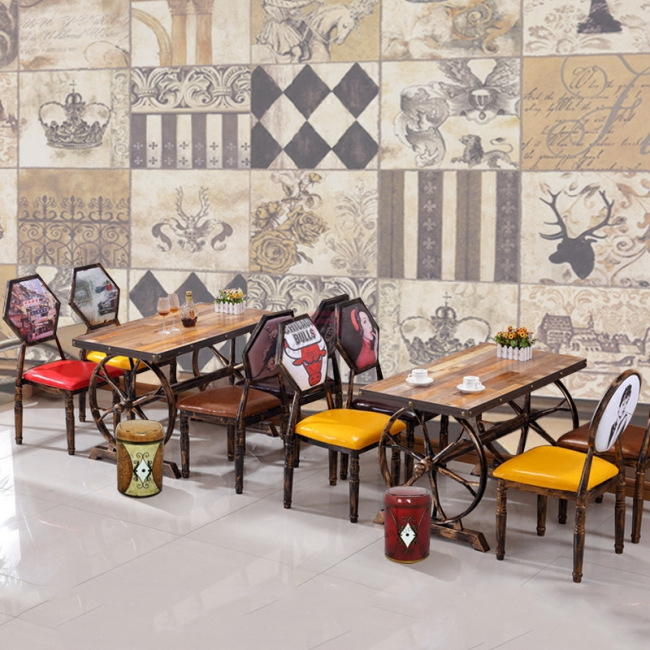 Industrial style wheel design commercial restaurant tables 4ft*2ft plywood & casting iron base custom made table